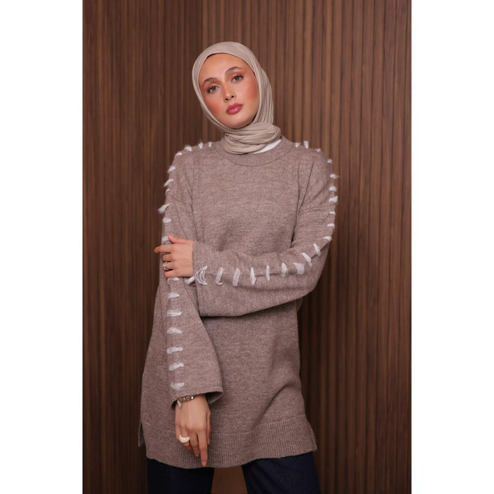 7028 Kolları İp Geçişli Yumoş Tunik - Kahverengi
