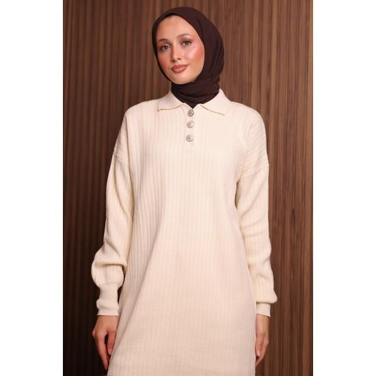7056 Yakalı Düğmeli Triko Takım - Bej