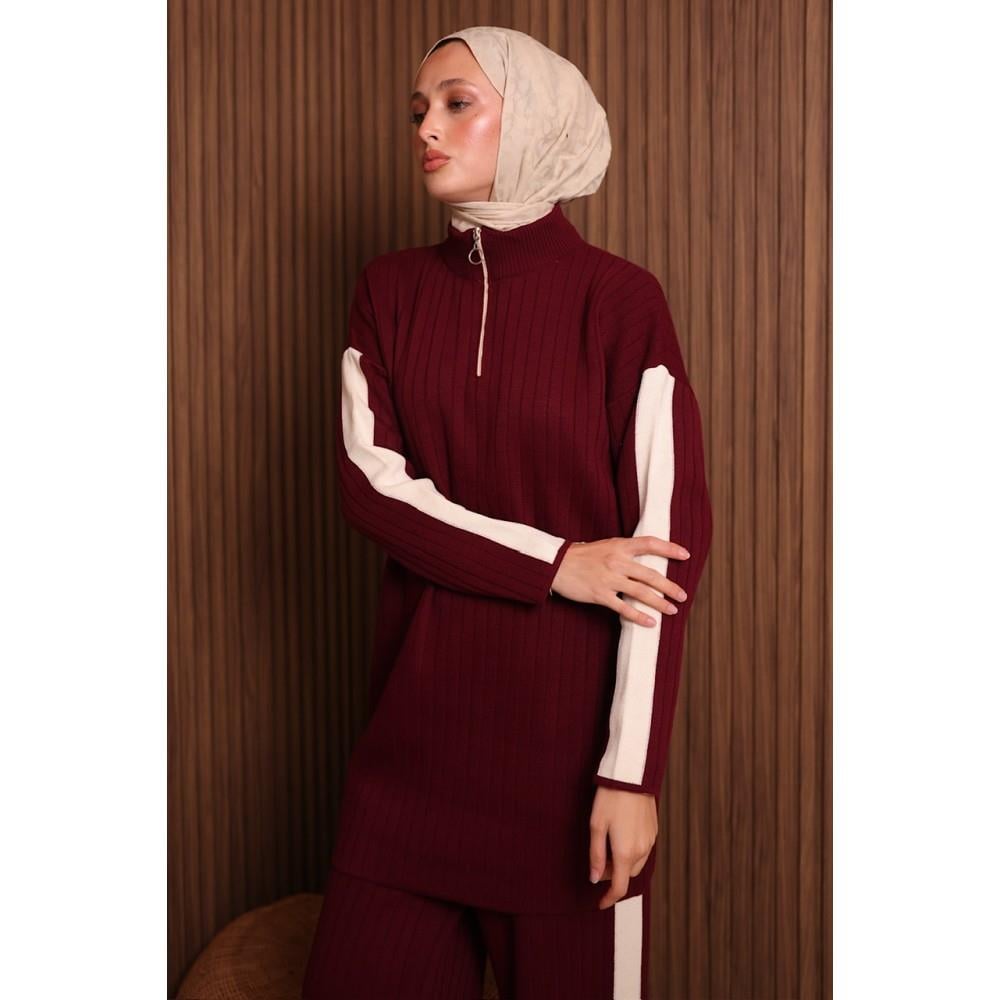 7058 Şerit Detaylı Fitilli Triko Takım - Bordo