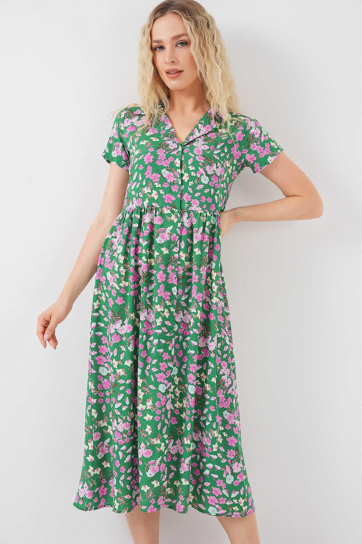 2561 Boydan Düğmeli Kısa Kol Çiçekli Elbise - Yeşil