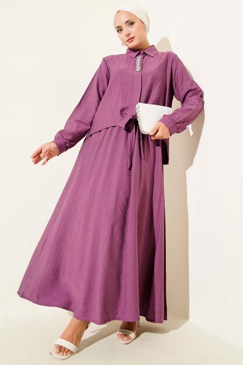 4945 Taşlı Etekli Çilek Takım - Mürdüm
