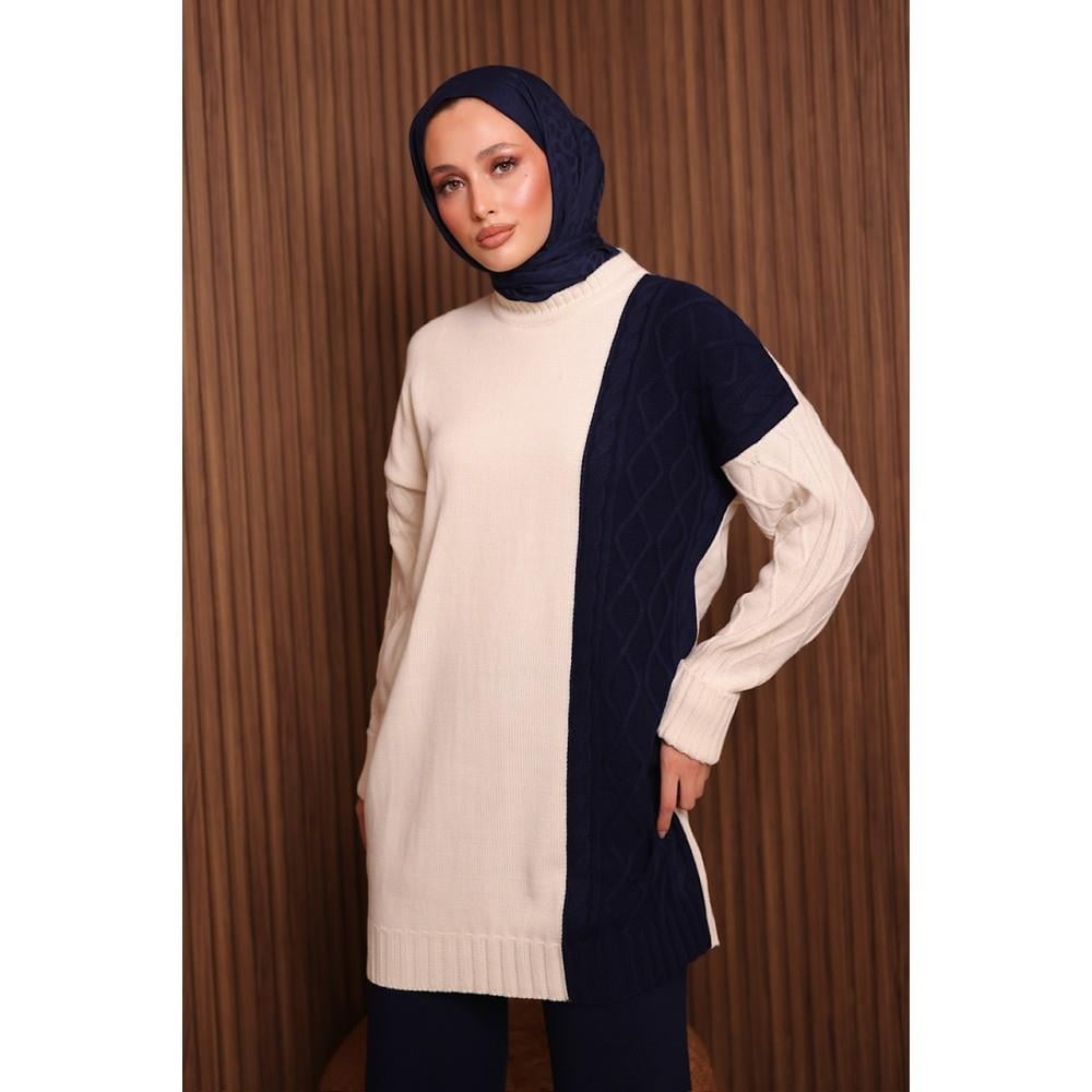 7040 Renk Garnili Örgü Desen Triko Takım - Lacivert